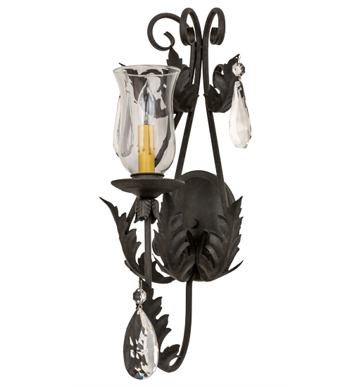 A luxurious sconce design comes to light with elegance and glamour. An Ivory faux candlelight covered with a Clear Hurricane Glass shade is perched on a fanciful bobeche. The luminaire is embraced by an exquisite Acanthus leaf accented arm with large Crystal pendalogues and faceted Crystal droplets. The decorative accents, frame and hardware are featured in a Chestnut Textured finish. This lovely wall fixture is handcrafted in our facility in Yorkville, New York. Custom sizes, styles, colors and dimmable energy efficient lamping options are available. The sconce is UL and cUL listed for damp and dry locations.