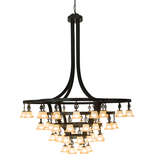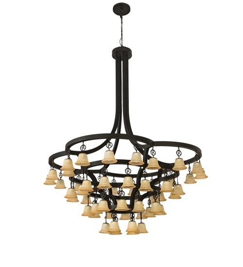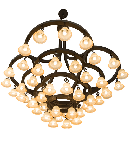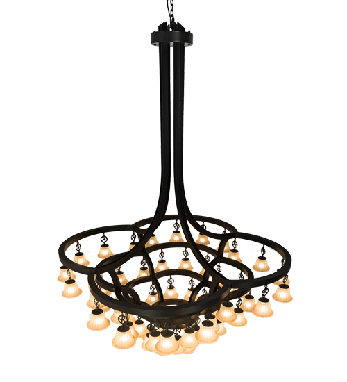 An elaborate lighting design created with detailed intricacy and powerful illumination. This magnificent, upscale chandelier features 4 curvaceous tiers embracing 58 exquisite handpainted Cream Fluted Glass shades like sprouting Bell shaded flowers. The overall height of this pendant ranges from 111 to 207 inches as the chain length can be easily adjusted to accommodate your specific lighting application needs. This masterful chandelier, which features a frame and hardware in a Solar Black powder coat finish, is ideal for lobbies, foyers, banquet rooms and reception areas. Handcrafted by highly skilled artisans in our 180,000 square foot manufacturing facility in Yorkville, NY. Custom colors, styles, and sizes available. Dimmable energy efficient lamping options offered. UL and cUL listed for dry and damp locations.