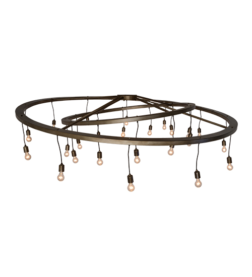 Perfect for a whimsical or Western aesthetic, the Donner chandelier exposes a pair of spoked ring wagon wheels detached from the stagecoach trekking across the Rockies. To provide a unique look and brilliant ambient illumination, 25 miniature Edison-style lamps cascaded from this intriguing ceiling fixture. The frame and hardware are featured in an Antique Hammered Gold finish. The fixture is handcrafted by skilled artisans in our 180,000 Yorkville, New York manufacturing facility. Custom options include special sizes, finishes, designs, and dimmable energy-efficient lamping options such as LED. UL and cUL listed for dry and damp locations.