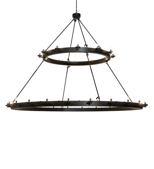 Blending an elegant style with a classic distinguished look. Loxley is custom crafted with 36 customer supplied lamps on two round tiers which are featured in a Solar Black finish. This oversized fixture is ideal for illuminating dining tables, entryways and lobbies in residential, commercial and hospitality settings. The overall height ranges from 77 to 148 inches as the chain length can be easily adjusted in the field to accommodate your specific lighting needs. The Loxley Chandelier is featured in our American made, American designed, handcrafted Contemporary Rustic Lighting Collection. Manufactured in Yorkville, New York. UL and cUL listed for dry and damp locations.