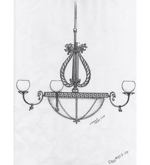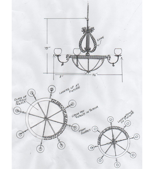 A dramatic theatrical lighting fixture that currently adorns the Traverse City, Michigan Opera House, our chandelier features a stunning Fleshtone Idalight shade trimmed with a dramatic Greek Key border design. Above the inverted dome shade is a striking, three-dimensional Golden finished Lyre with fanciful grape accents, and eight arms embracing hand-blown etched glass globes from France. Hardware is hand finished in Light Burnished Brass. Includes a canopy, 10 feet of chain and 12 feet of wire.Handcrafted in our 180,000 square foot manufacturing facility in Yorkville, New York. Shade colors, metal finishes and fixture sizes can be customized.