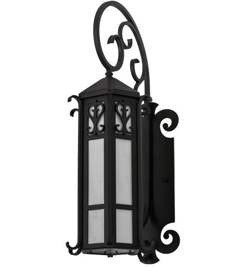 Grand stature and an ornate hand-forged metalwork create a rich, luxurious look for the Caprice Wall Sconce. The wall fixture features White art glass enhanced with a scrolled arm and accents featured in a Solar Black finish. This fixture is ideal to complement a variety of architectural styles for today’s exteriors and interiors. Custom crafted in the USA, this fixture is offered in custom sizes, finishes and styles, as well as energy efficient lamping options.