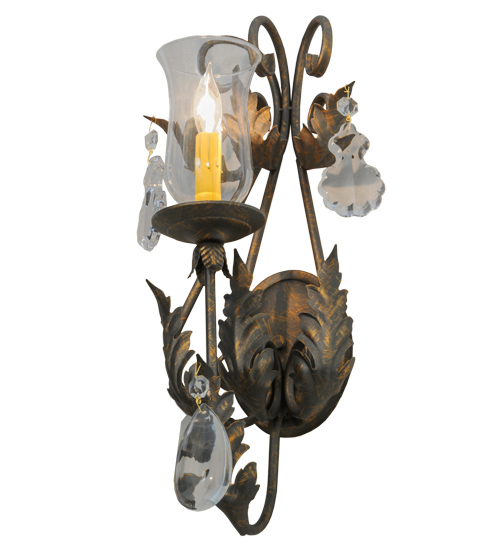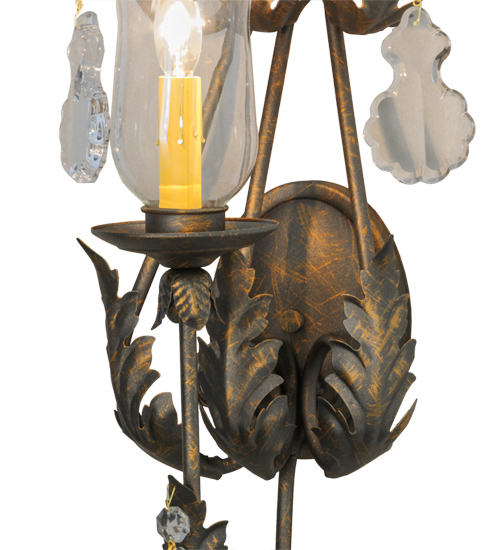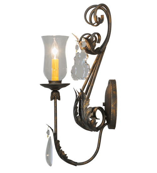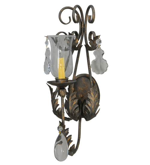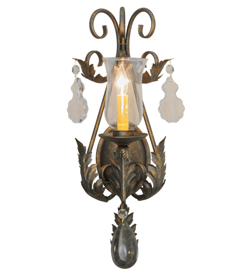 A luxurious wall sconce design comes to light with elegance and glamour. An Amber faux candlelight covered with a Clear Hurricane Glass Shade is perched on a bobeche, which is embraced by an exquisite Acanthus leaf accented arm with Crystal Pendalogues and scrollwork. The decorative accents, frame and hardware are featured in a French Bronze finish. This lovely wall fixture is handcrafted in our facility in Yorkville, New York. Custom sizes, styles, colors and dimmable energy efficient lamping options such as LED are available. The sconce is UL and cUL listed for damp and dry locations.