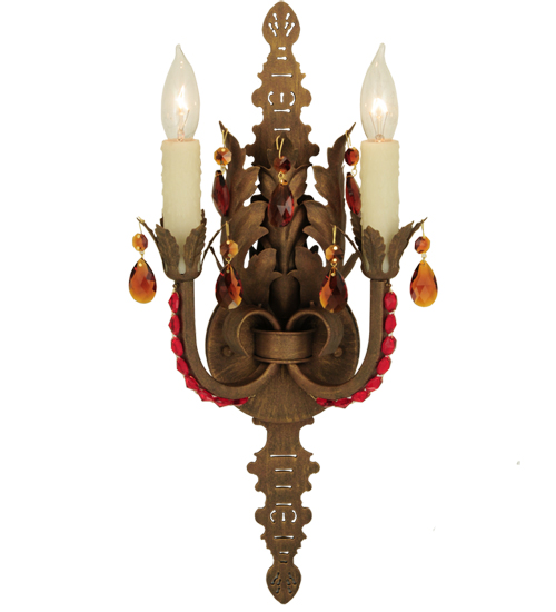 Discover the romantic aesthetics of this lovely nature-inspired design which renders two Ivory faux candlelights perched on floral bobeches with scrolled arms. This elegant sconce is adorned with Red Beads and accented with Amber Crystal Droplets and metal Acanthus leaves. Handcrafted in our manufacturing facilities in Upstate New York, this fixture is offered with custom styles, finishes and sizes. Offered with dimmable LED and other energy efficient lamping options. The 20-inch tall wall luminaire is UL and cUL listed for dry and damp locations.