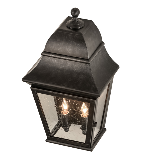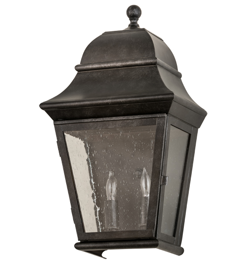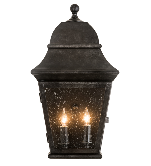 A stately charm and sophisticated elegance are combined to create the Vincente Lantern, an interior and exterior wall sconce. This elegant sconce features Clear Seeded Glass with a tapered frame and hardware offered in a Smoke finish. The fixture reveals 2 faux candlelights in a matching handpainted finish with Customer-supplied Candelabra lamps. Custom crafted by highly skilled artisans in our 180,000 square foot manufacturing facility in Yorkville, New York. This exquisite fixture is offered in custom styles, colors and sizes are available. Energy efficient lamping options such as LED are available. The 16-inch tall fixture is UL and cUL listed for dry, damp and wet locations.