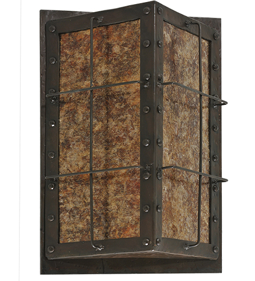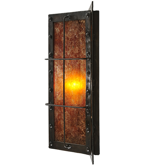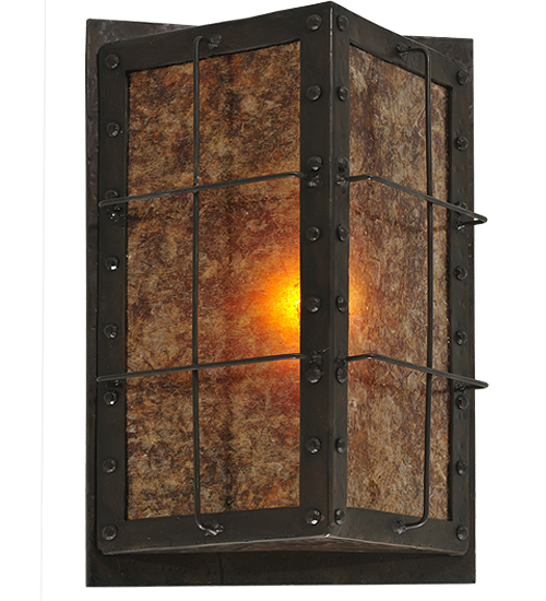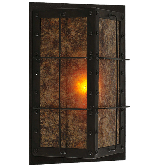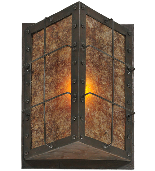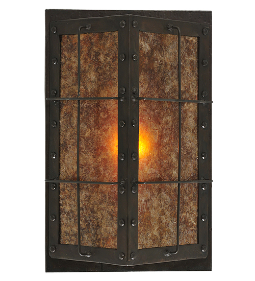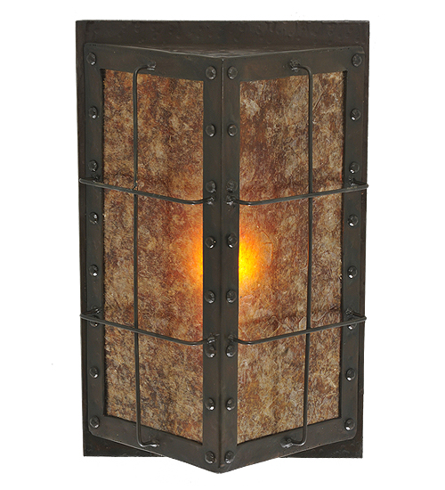 Like a lighted window described in a Charles Dicken novel, this handsome dimensional, angular wall fixture features a thin steel geometric structural design which encases stunning Amber Mica. The fixture, which produces beautiful ambient light, is enhanced with decorative accents and hardware featured in a bold Costello Black finish. Handcrafted in the USA, this fixture is available in custom sizes, styles, colors and dimmable energy efficient lamping options. The fixture is UL and cUL listed for dry and damp locations.