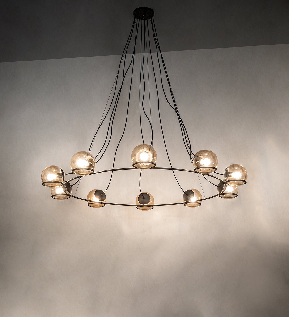 A cool contemporary look. 10 Smoke Glass orbs are enhanced with a Blackened Steel finish and custom configurable to make a stunning design statement. Ideal for lighting lobbies, entryways, and other large spaces in residential, hospitality, and commercial settings. Overall height ranges from 32 to 73 inches as the aircraft cable adjusts in the field. The Tyngsboro 10 Light Pendant is included in our American-made, American-designed handcrafted Modern Lighting Collection. Manufactured in Yorkville, NY. UL & cUL listed for dry and damp locations.