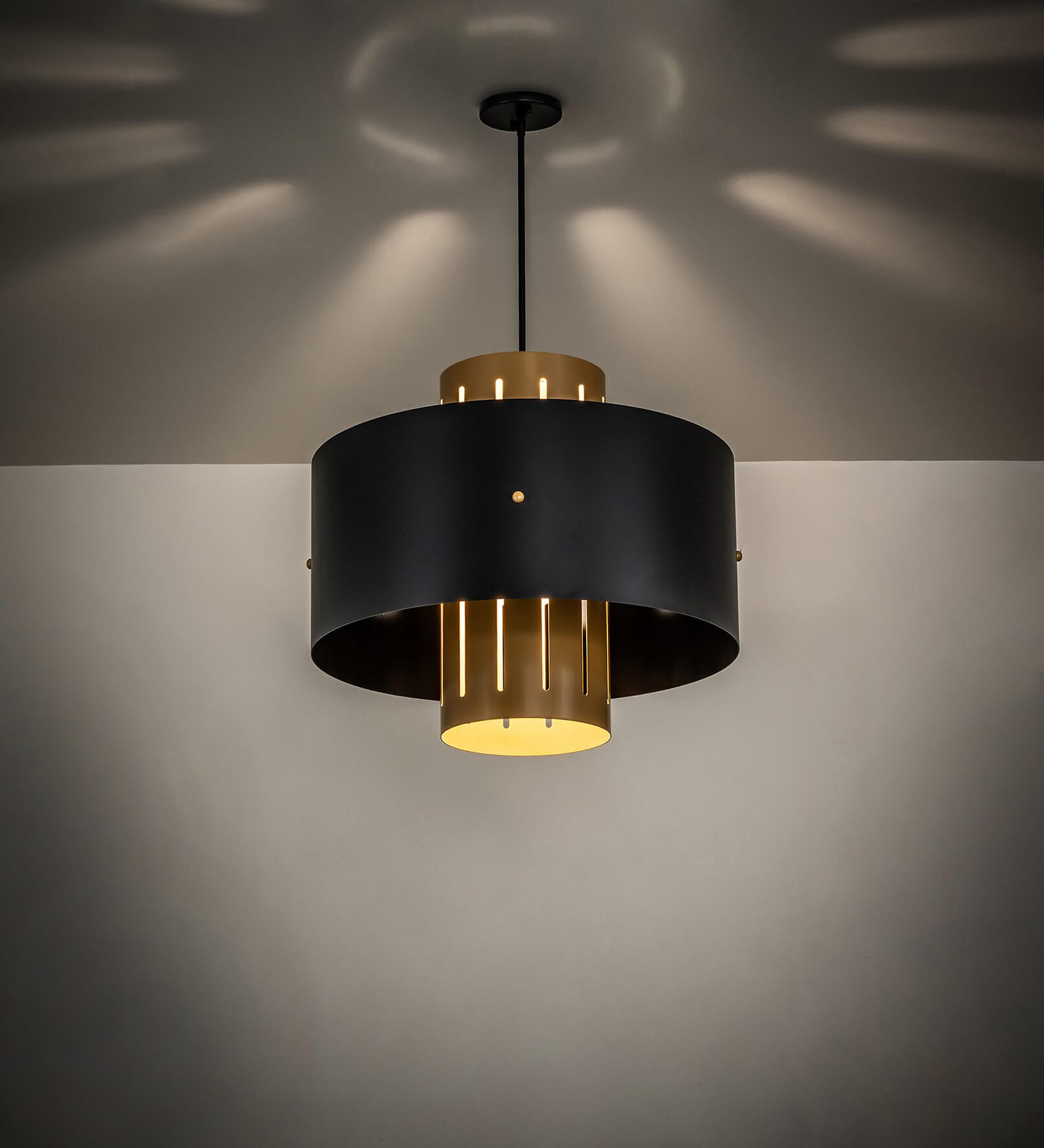 This stunning ceiling pendant offers a curvaceous profile that integrates a modern look with an industrial style. The fixture features a stunning Solar Black-finished outer shade surrounding a Sahara Gold finished cylinder. The ceiling fixture can illuminate dining areas and entryways in homes, lounges, and restaurants. The Cilindro Pendant is included in our American-made, American-designed, handcrafted Modern Lighting Collection and manufactured in Yorkville, NY. The fixture is UL & cUL listed for dry and damp locations.