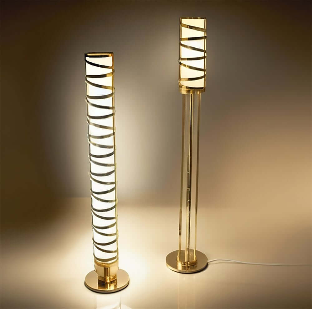 Designed by Bryan Hamlin, the Embrace Floor Lamp was inspired by the geometries of vacuum tube radios from the late 1930s. Embrace features complex illuminated forms that appear to be in motion. Spiraling illuminated components create an interlocking combination of light and shadow. The lamp is designed with a Satin Brass finished structure with a Statuario Idalight diffuser. The lamp illuminates with Integral 3000K LEDs for beautiful 3000K light, energy savings, and long life. The Embrace Floor Lamp is included in our American-made, American-designed Handcrafted Bryan Hamlin Collection, which is manufactured in Yorkville, New York. The lamp is UL and cUL Listed for dry locations. The Embrace design can be customized in nearly infinite design variations, including fixtures for ceiling and wall lighting applications.